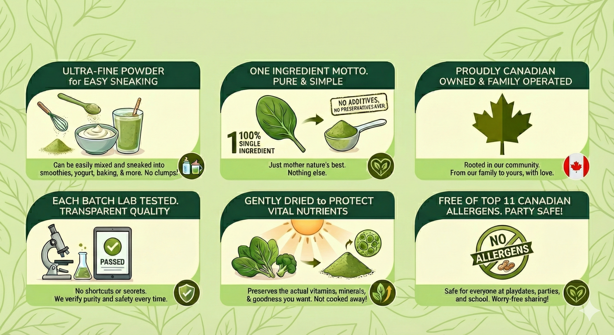 We take the purest ingredients and simply powder them to preserve nutrients. Our ready-to-use formula means no pills, no prepping. Just scoop and stir into your family's favorite foods.