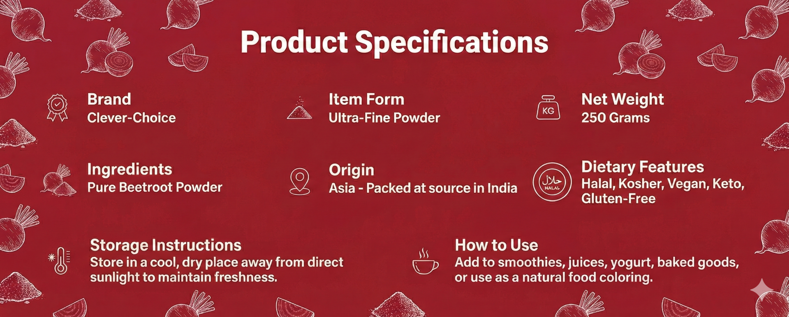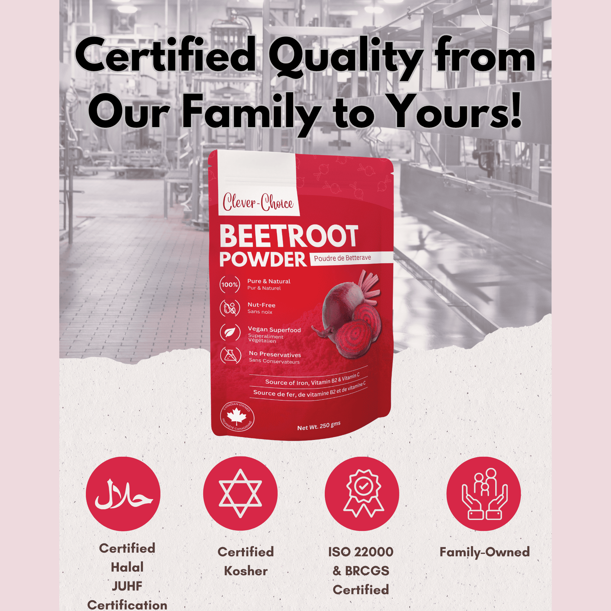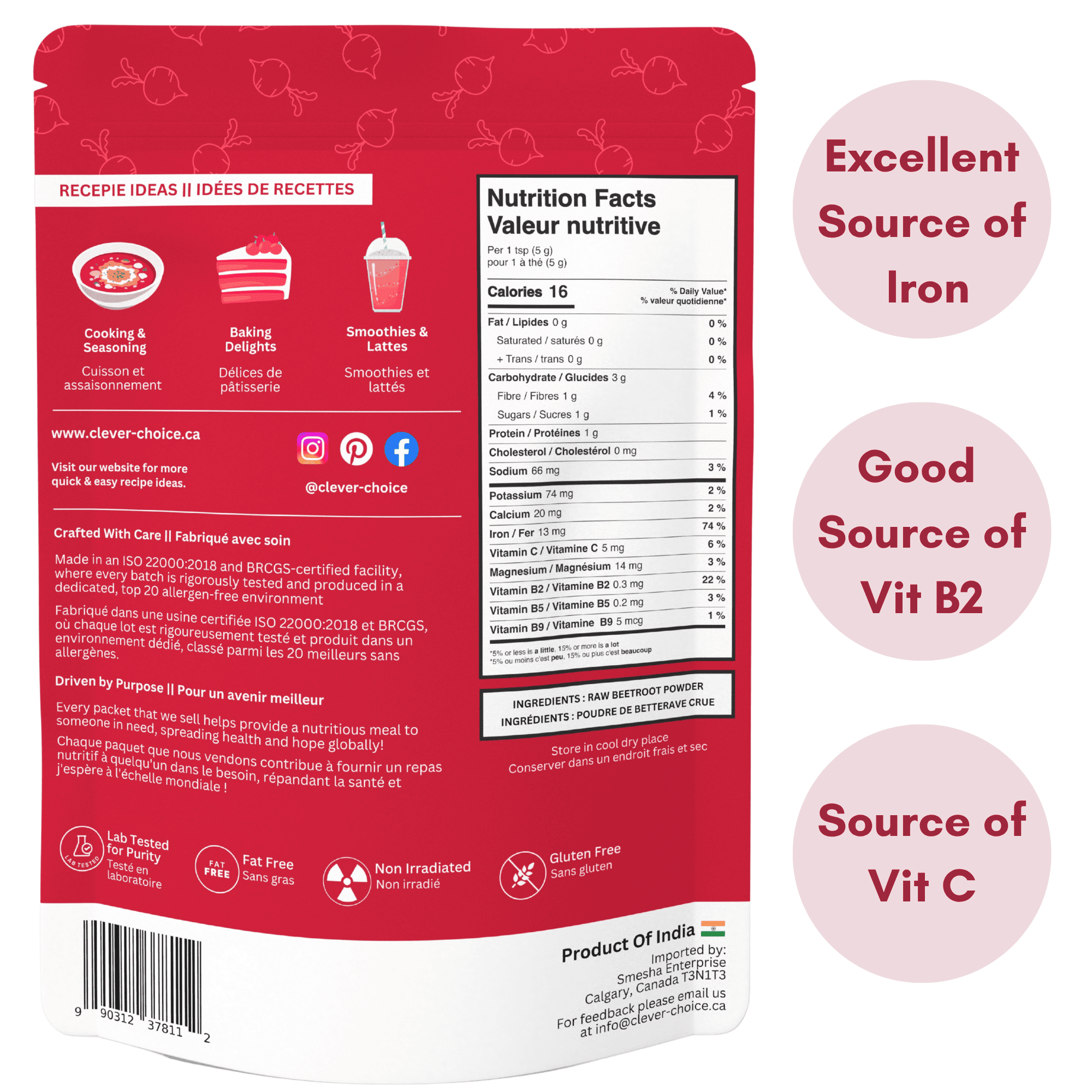 Clever-Choice Beetroot Powder is a versatile and potent superfood supplement, gently dried to lock in maximum natural nutrients. As a concentrated source of Iron, Vitamin B2, and Vitamin C, our powder serves as an easy daily supplement. It’s renowned for its natural nitrate content, making it the perfect pre-workout or energy boost for active families. Plus, its vibrant color makes it a safe, natural food dye.