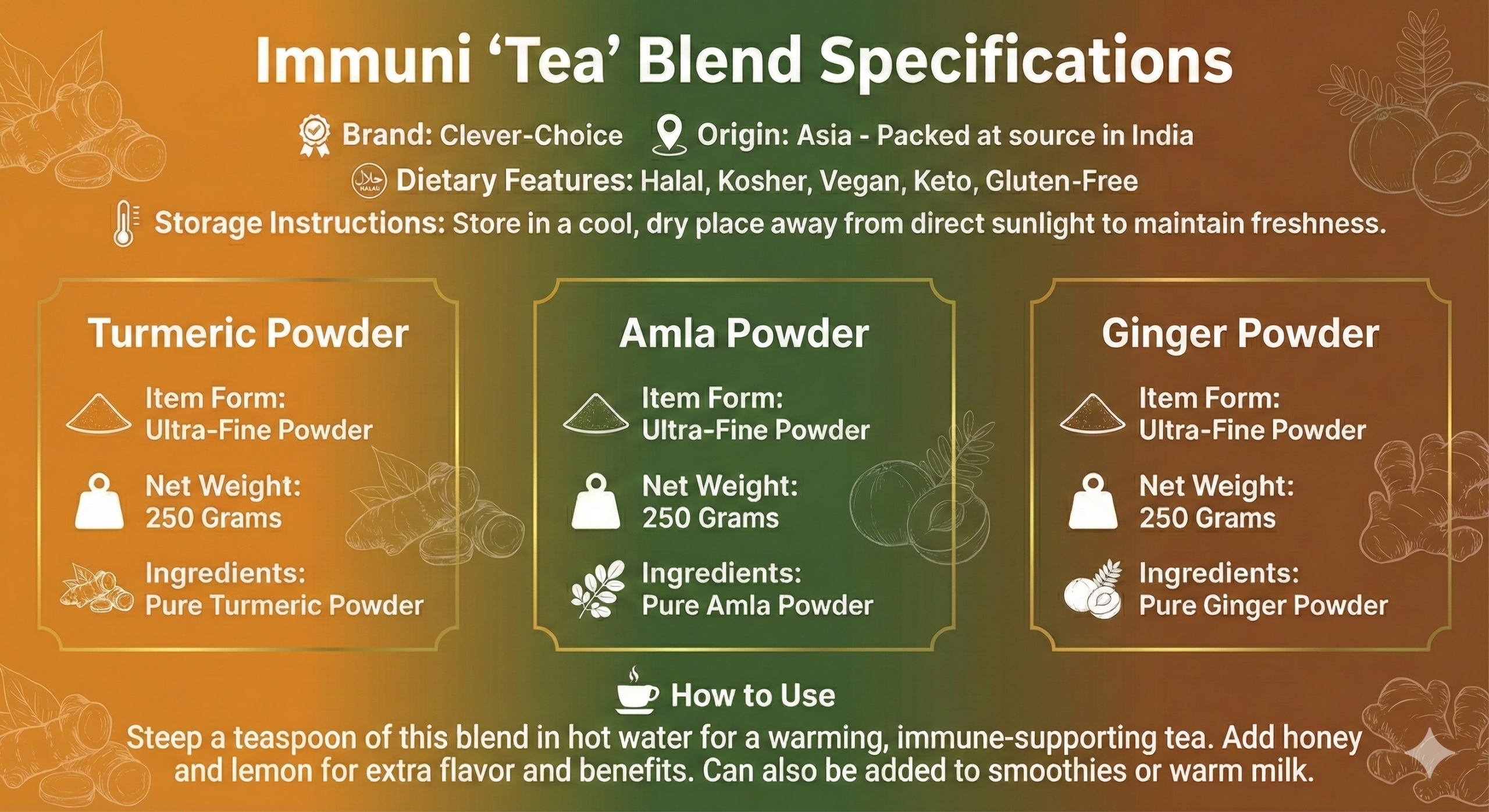 Prepare your body for seasonal changes with the Clever-Choice Immuni ‘Tea’ Blend. This potent trio combines the warming, anti-inflammatory power of Ginger Powder and Turmeric Powder with the immune-boosting Vitamin C fireworks of Amla Berry Powder. This is the perfect blend to transform into the ultimate wellness latte—your natural shield for when the leaves fall or noses start to run.